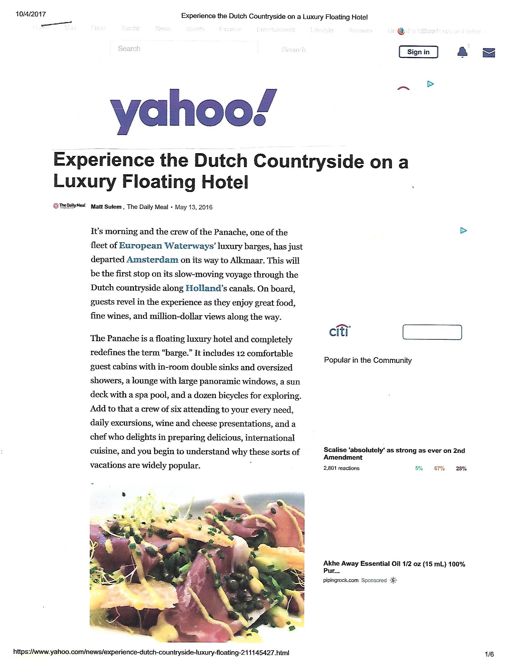 Yahoo News: Luxury Cruising Through the Dutch Countryside on a Luxury Cruise. Published 10/4/2017